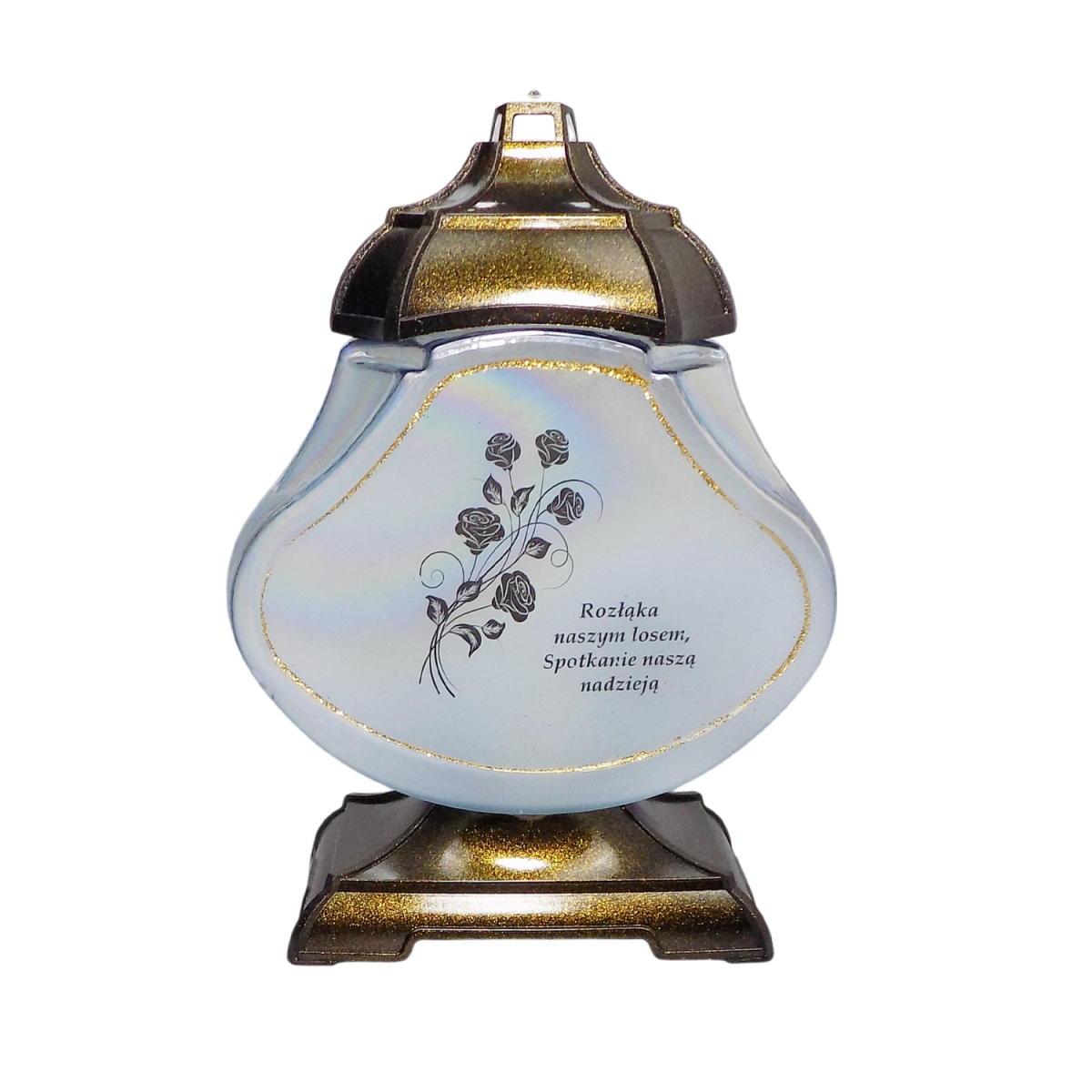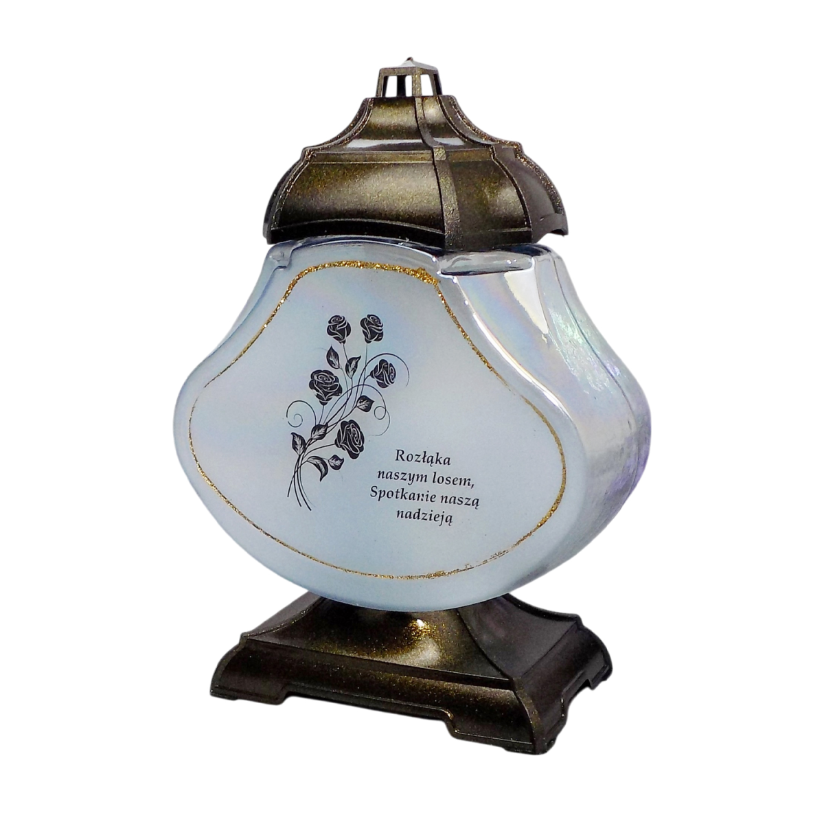 Вишукана меморіальна лампадка з ніжним матовим склом та декоративним золотистим оздобленням створює особливу атмосферу спокою та пам’яті. Елегантна форма та витончений квітковий малюнок із написом додають виробу глибокого символізму. Міцна основа та кришка забезпечують стійкість і довговічність. Лампадка підходить для вкладів та LED свічок, практична у використанні та стійка до погодних умов