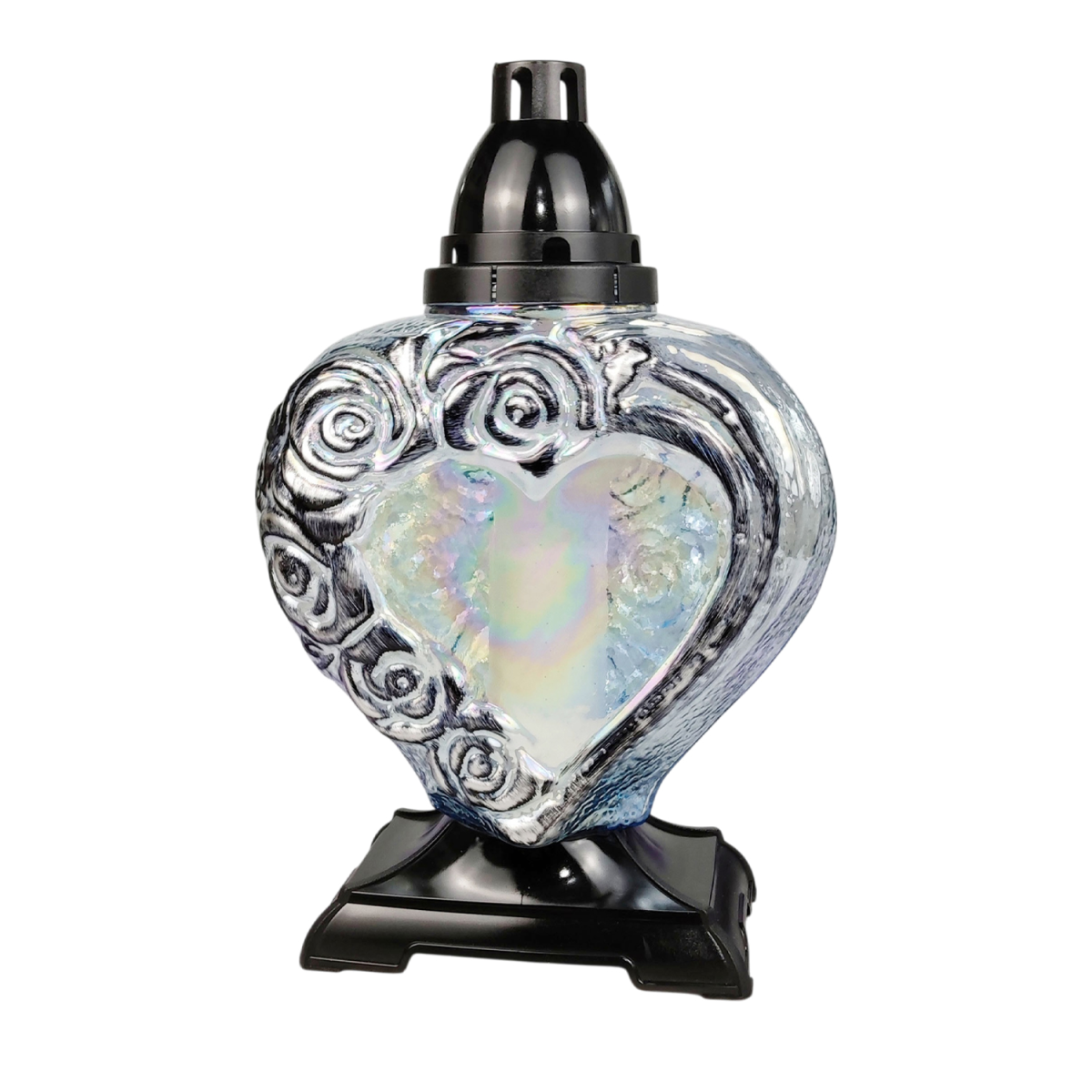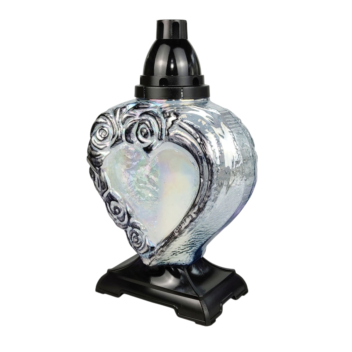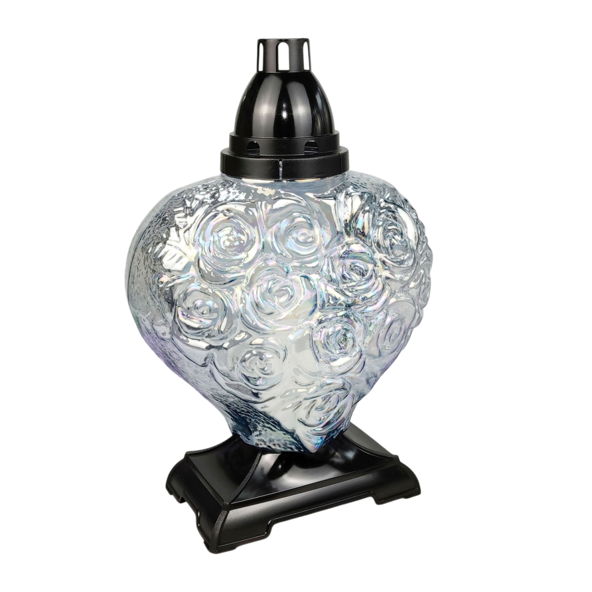 Елегантна ритуальна лампадка у формі серця з об’ємним декоративним орнаментом у вигляді троянд. Вишуканий дизайн поєднує символ любові та світлої пам’яті, створюючи особливу атмосферу тепла й шани до близьких.