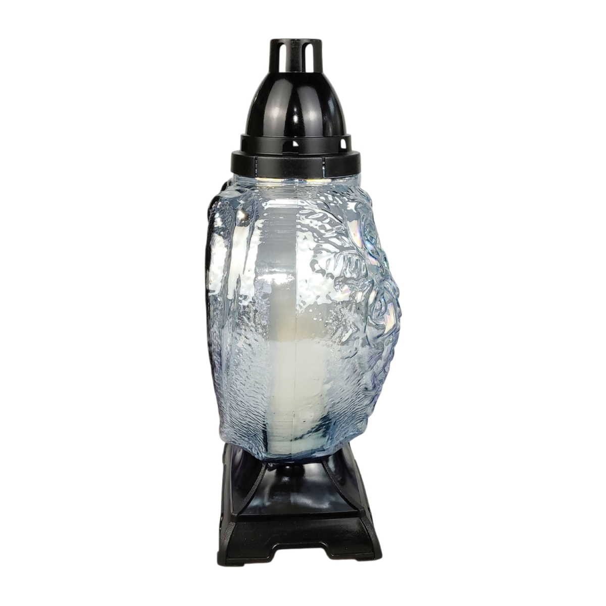 Корпус виконаний із декоративного скла з рельєфною фактурою та переливчастим ефектом, що красиво відбиває світло свічки. Лампадка встановлена на стійкій основі та оснащена вентиляційною кришкою для безпечного та рівномірного горіння.
