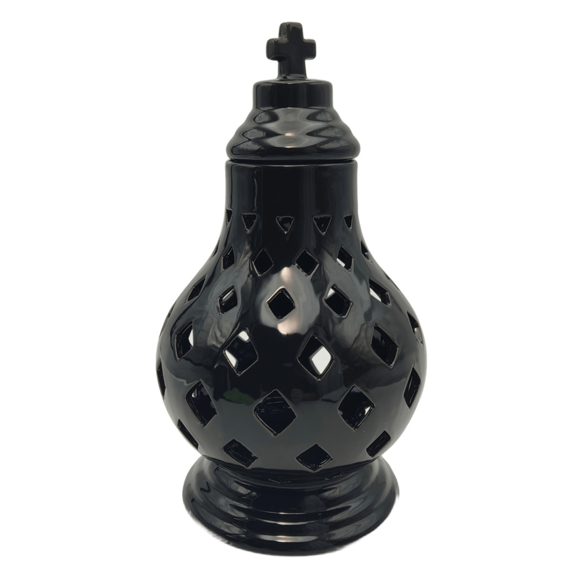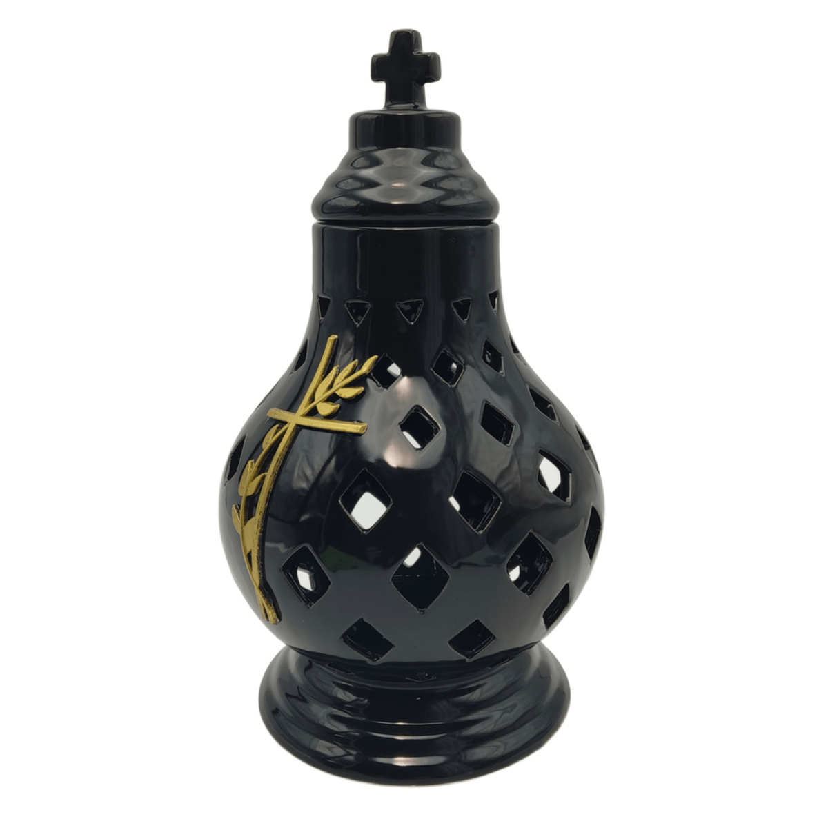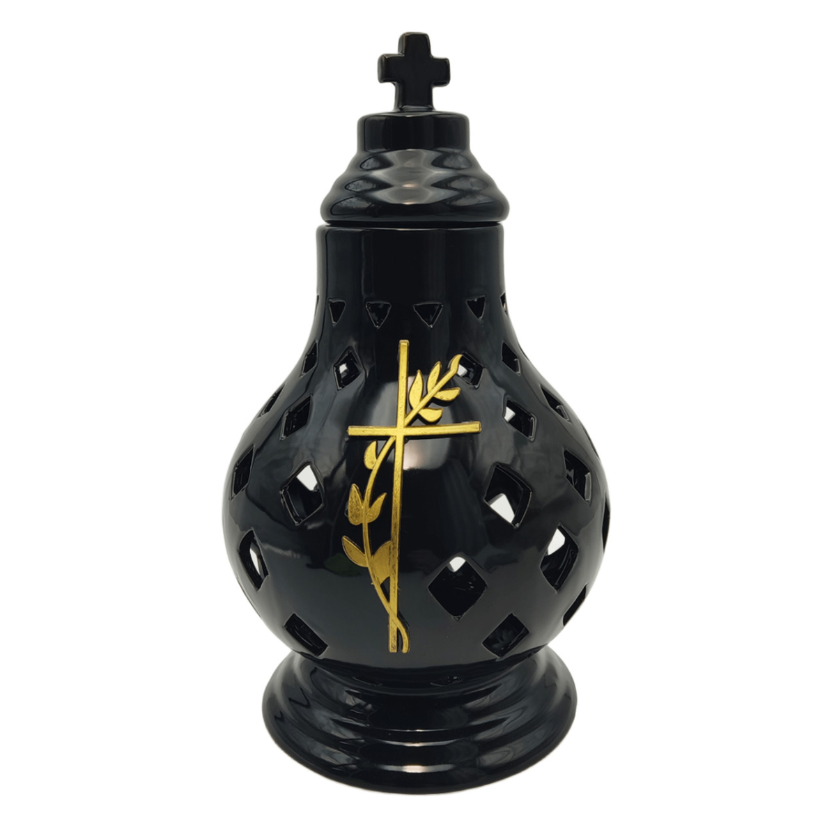 Лампадка - стриманий і символічний виріб, який запалюють на могилах померлих у пам’ять про померлих під час поминальних днів або особливих дат, що символізує незгасаючу пам’ять і молитовну підтримку душ. Матеріал: кераміка Час горіння свічки: не входить до комплектації Пакування: 6 шт Висота: 30 см Ширина: 18 см Глибина: 18 см Вага: 1,7 кг Призначено для використання: цвинтар, пам“ятні заходи та меморіали тільки зовнішнє використання простота у використанні, можливість зміни свічки без зміни лампадки може використовуватися як зі свічками, так і з лампами LED стійка основа забезпечує розміщення на різних поверхнях і мінімізує можливість перекидання не містить токсичних речовин виготовлена з високоякісних матеріалів