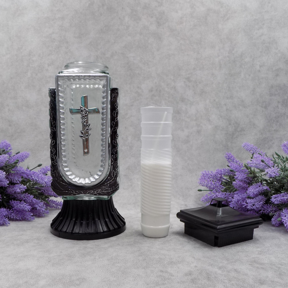 Лампадка зі свічкою-запаскою - виготовлена з високоякісних матеріалів, не містить токсичних речовин, не коптить і абсолютно безпечна для здоров“я. Матеріал: скло/пластик Час горіння свічки: ≈ 45 год Пакування: 6 шт Висота: 31 см Ширина: 13 см Глибина: 11 см Вага: 1,1 кг Призначено для використання: цвинтар, пам“ятні заходи та меморіали тільки зовнішнє використання простота у використанні, можливість зміни свічки без зміни лампадки може використовуватися як зі свічками, так і з лампами LED стійка основа забезпечує розміщення на різних поверхнях і мінімізує можливість перекидання