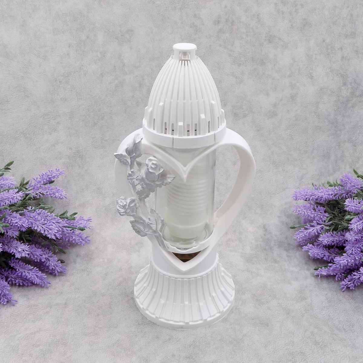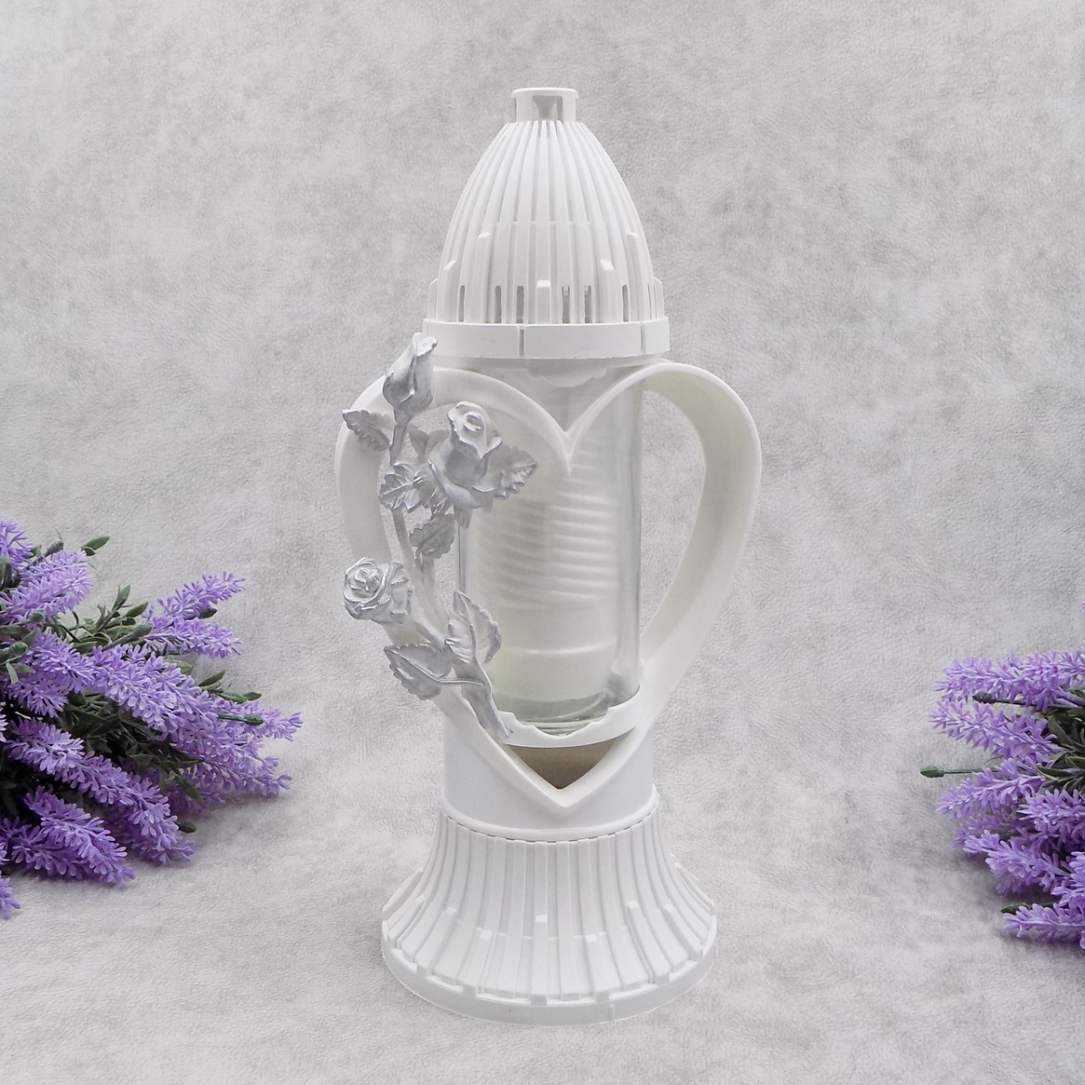 Лампадка середня Пам’ять у серці 3D біла зі сріблястою трояндою