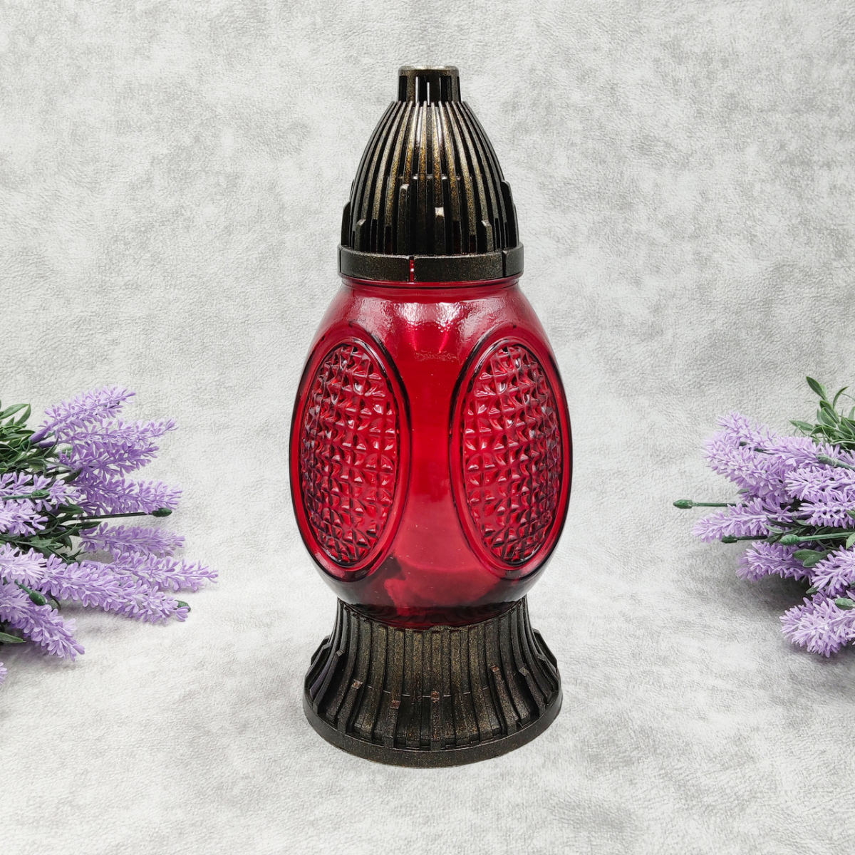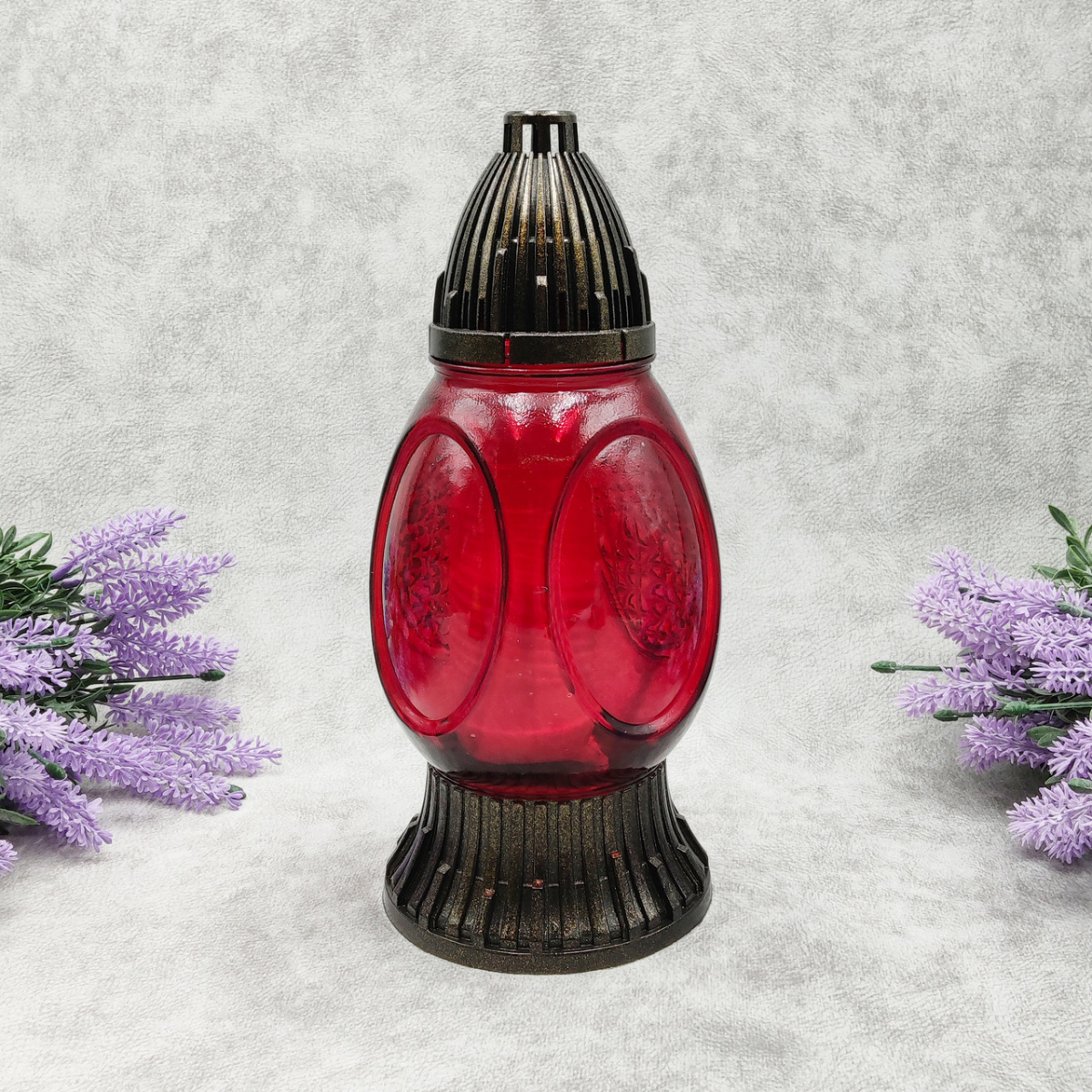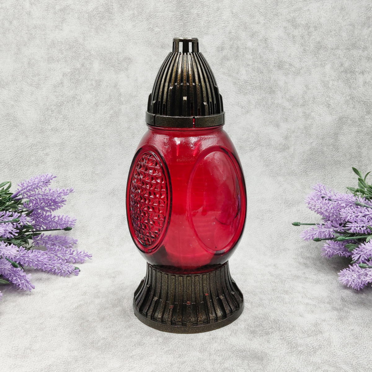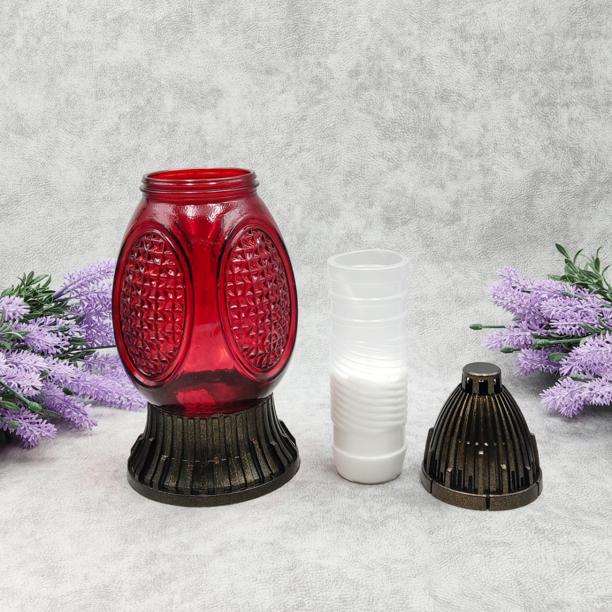 Лампадка зі свічкою-запаскою - виготовлена з високоякісних матеріалів, не містить токсичних речовин, не коптить і абсолютно безпечна для здоров“я. Матеріал: скло/пластик Час горіння свічки: ≈ 20 год Пакування: 8 шт Висота: 26 см Ширина: 11 см Глибина: 11 см Вага: 0,5 кг Призначено для використання: цвинтар, пам“ятні заходи та меморіали тільки зовнішнє використання простота у використанні, можливість зміни свічки без зміни лампадки може використовуватися як зі свічками, так і з лампами LED стійка основа забезпечує розміщення на різних поверхнях і мінімізує можливість перекидання