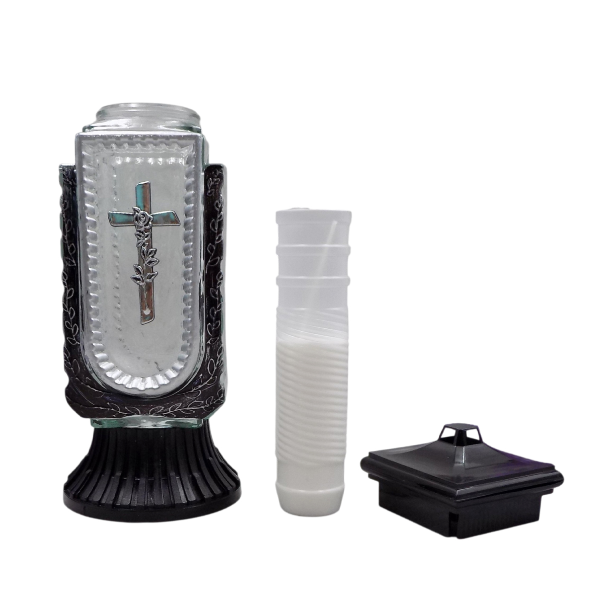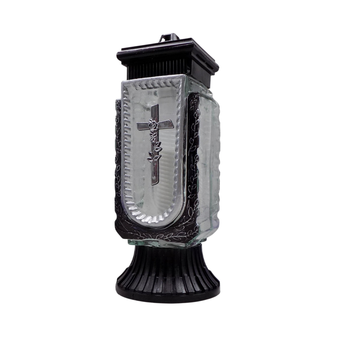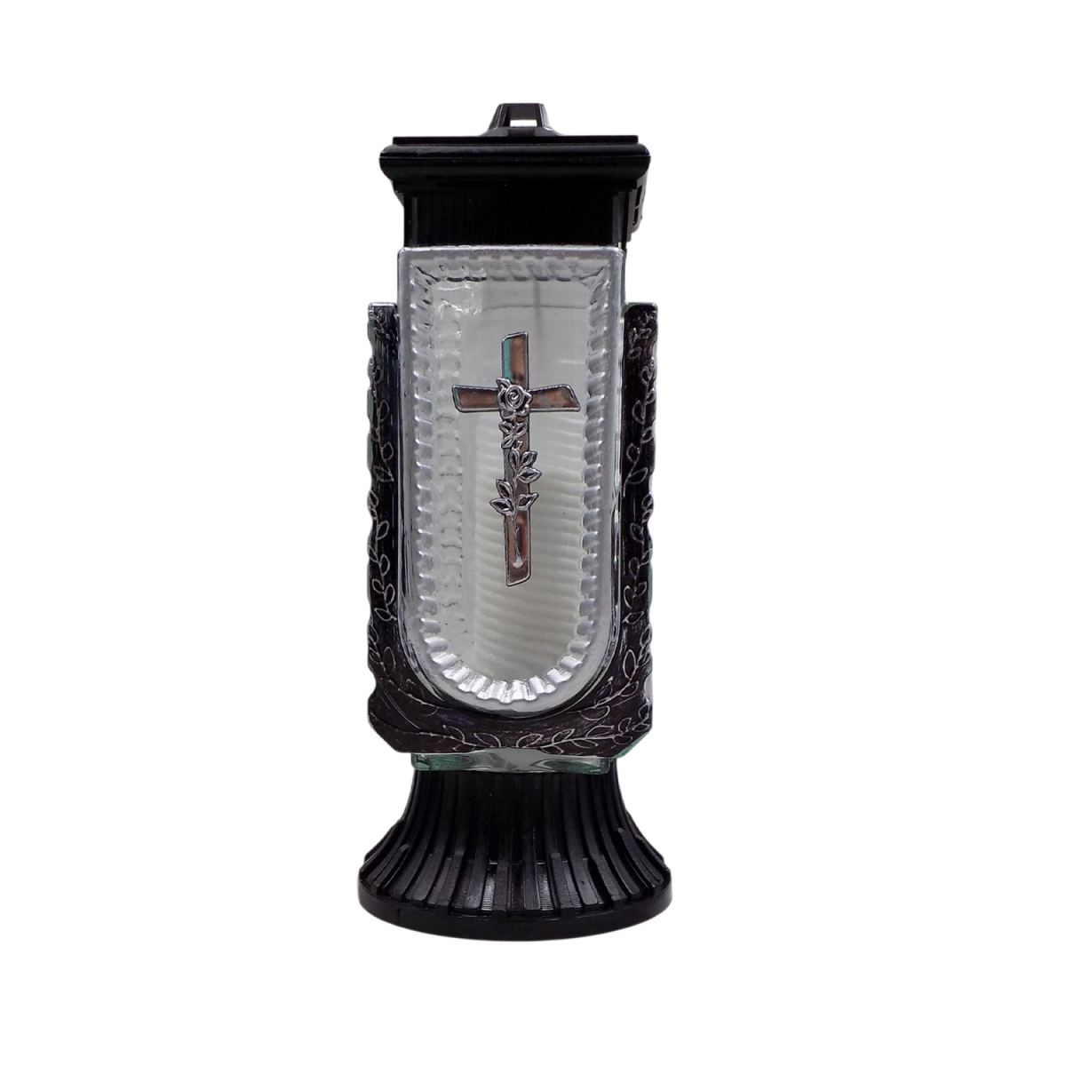 Елегантна лампадка зі скляною колбою прямокутної форми з декоративною вставкою та хрестом — символом пам’яті, віри та пошани. Витончений дизайн із рельєфними елементами та контрастною основою надає виробу стриманого, але благородного вигляду.