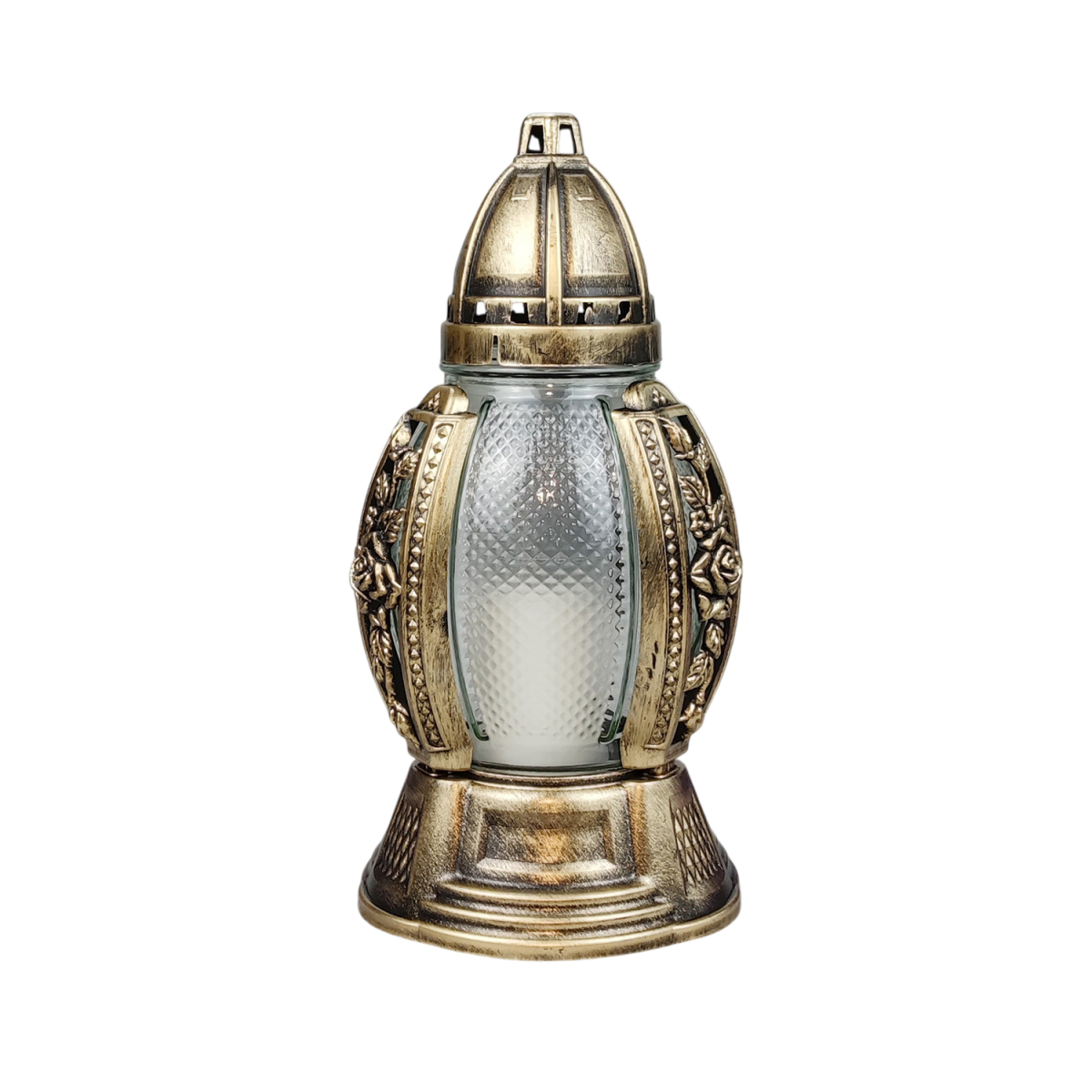 Скляна колба з рельєфною поверхнею красиво розсіює світло, створюючи м’яке та спокійне свічення. Декоративні елементи у вигляді квіткового орнаменту додають елегантності та підкреслюють пам’ятний характер виробу.