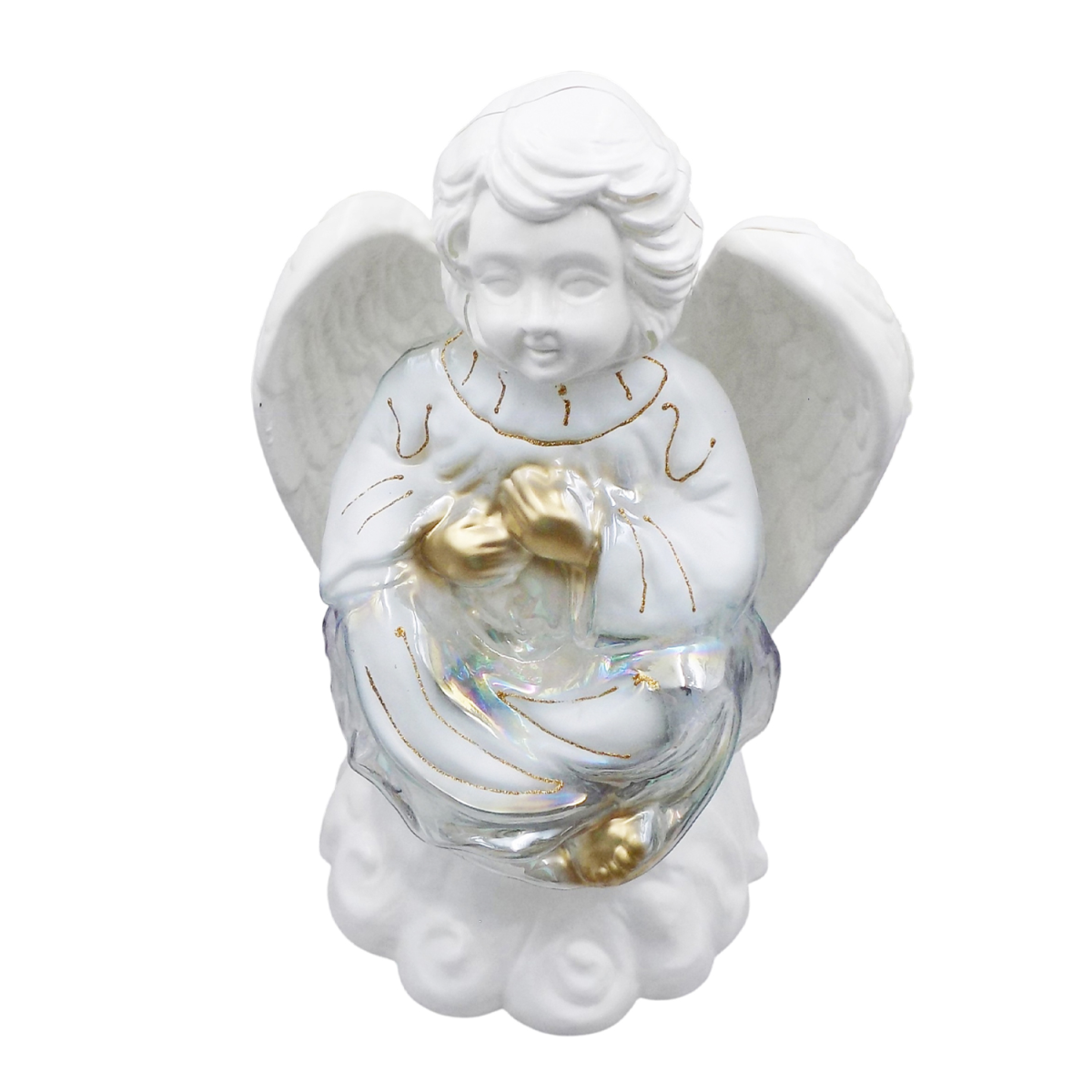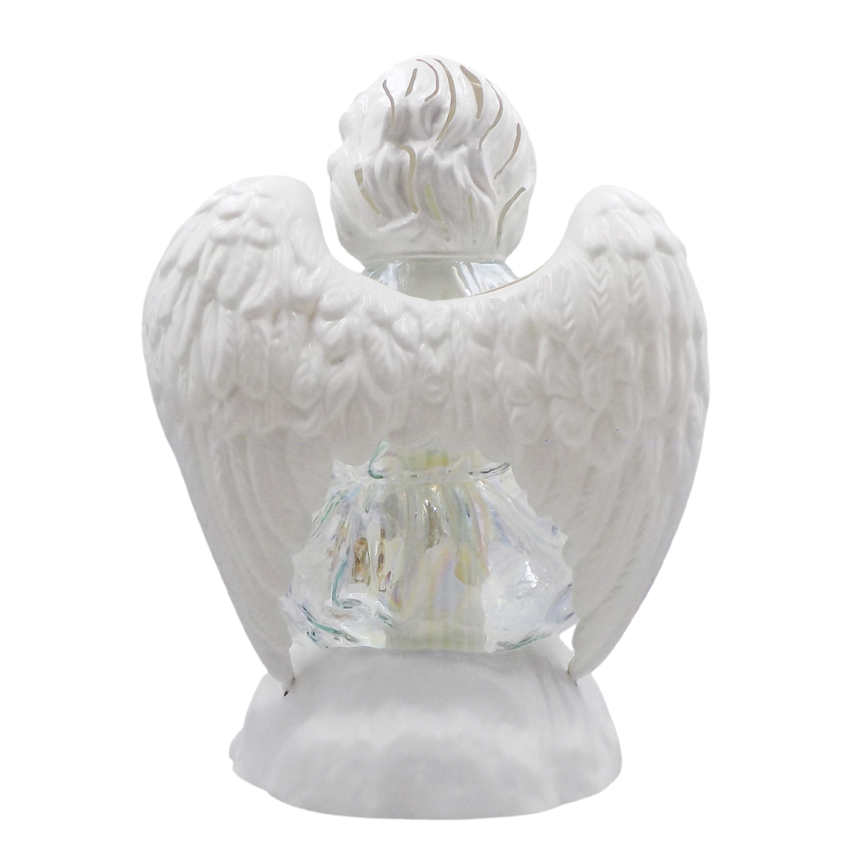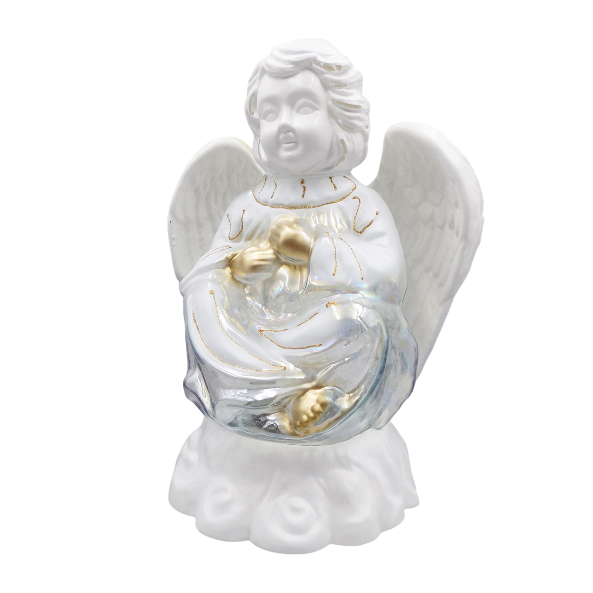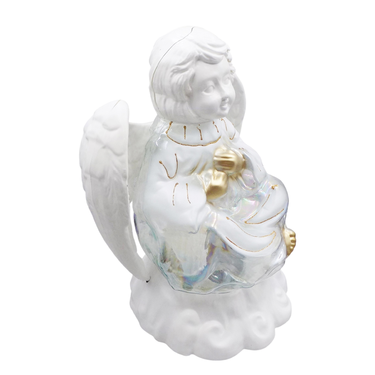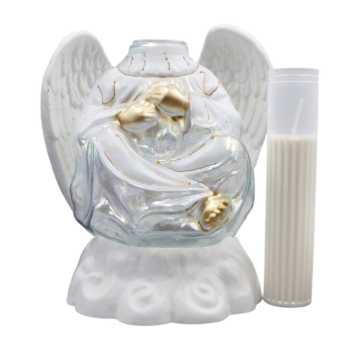 Перламутрові переливи декоративного елементу гармонійно поєднуються з білосніжною фігурою ангела, підкреслюючи чистоту образу та додаючи виробу вишуканості. Світло свічки м’яко відбивається від поверхні, створюючи делікатне сяйво, яке виглядає благородно як вдень, так і в темну пору.
