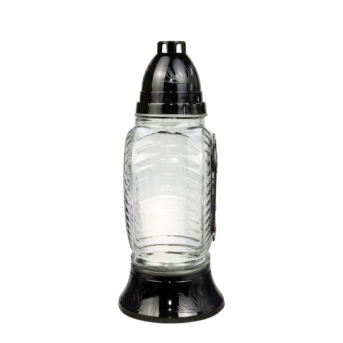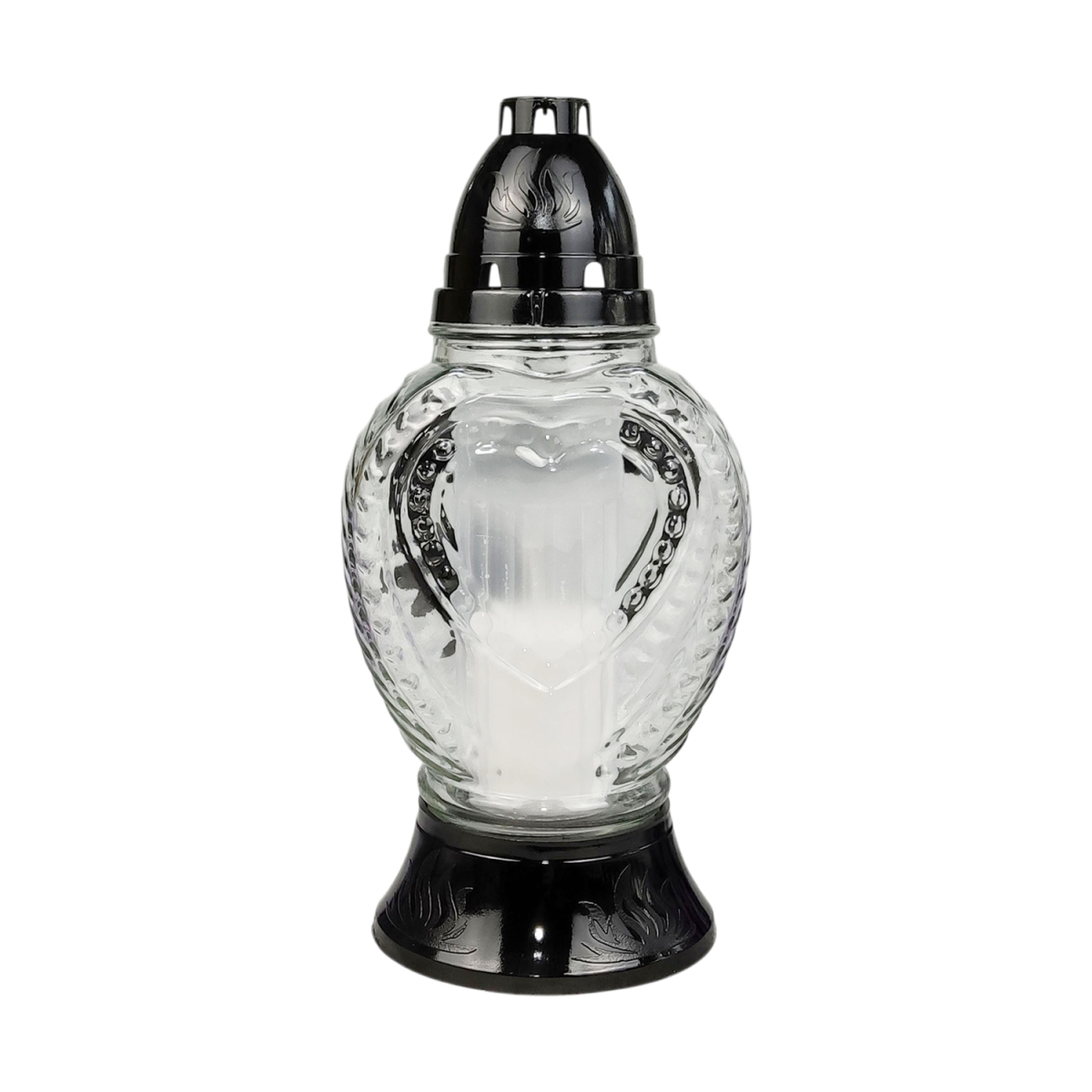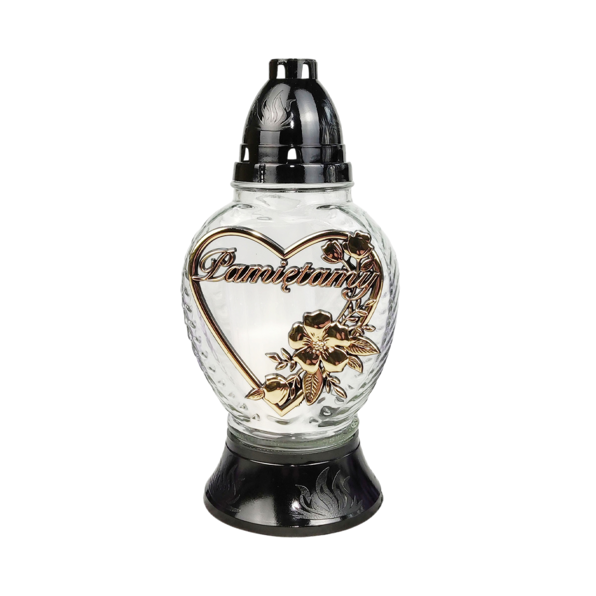 Елегантна лампадка з прозорою скляною колбою та витонченим декором у вигляді серця з написом Пам’ятаємо — символ світлої пам’яті, любові та поваги. Гармонійне поєднання чорної основи та золотистих елементів надає виробу благородного та виразного вигляду.