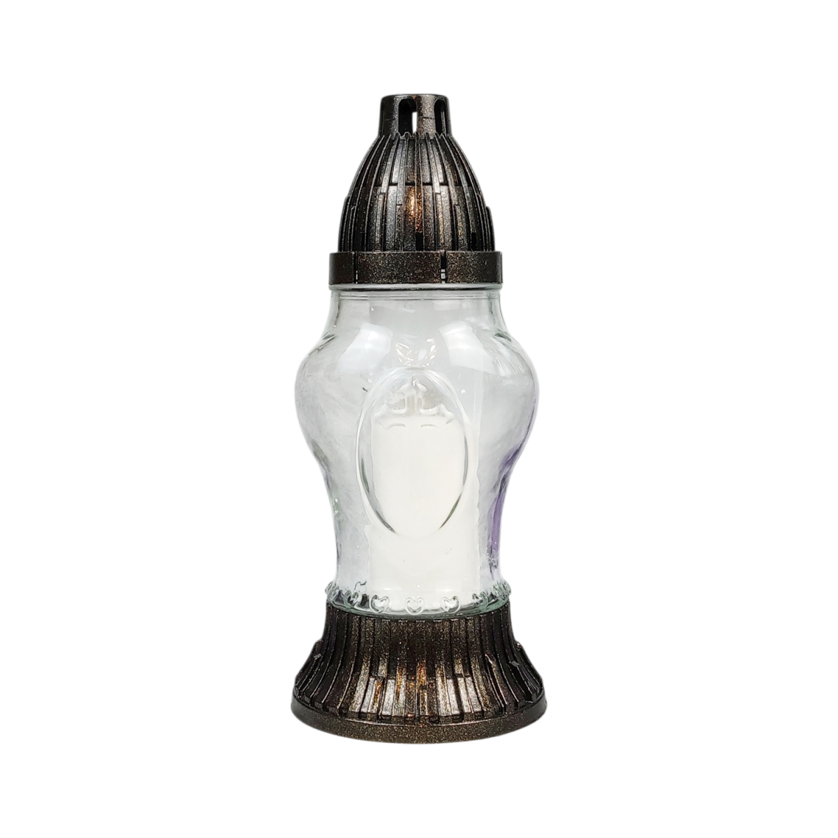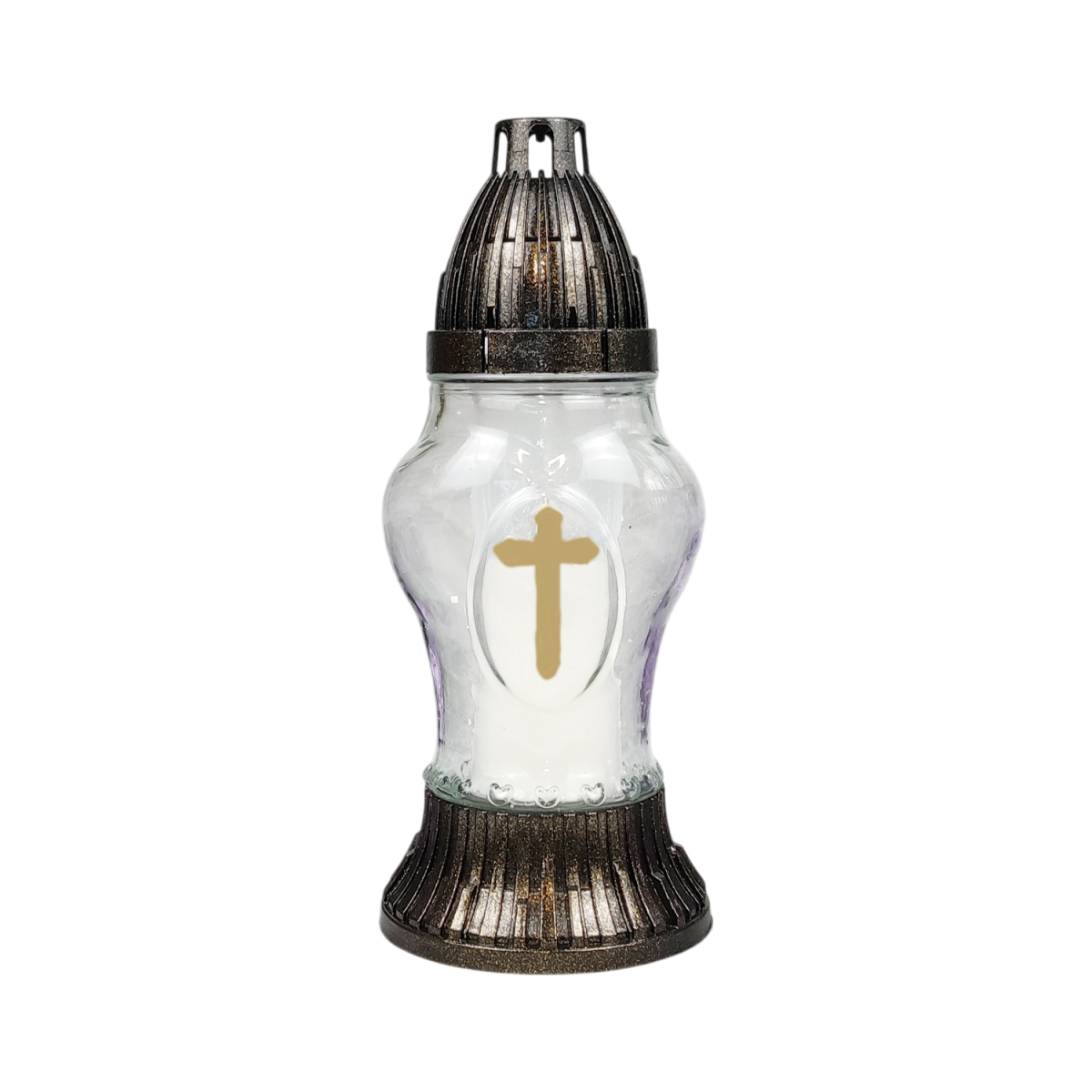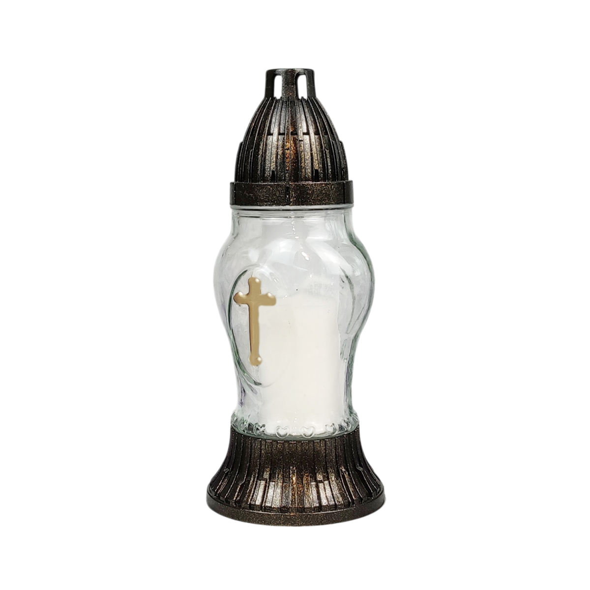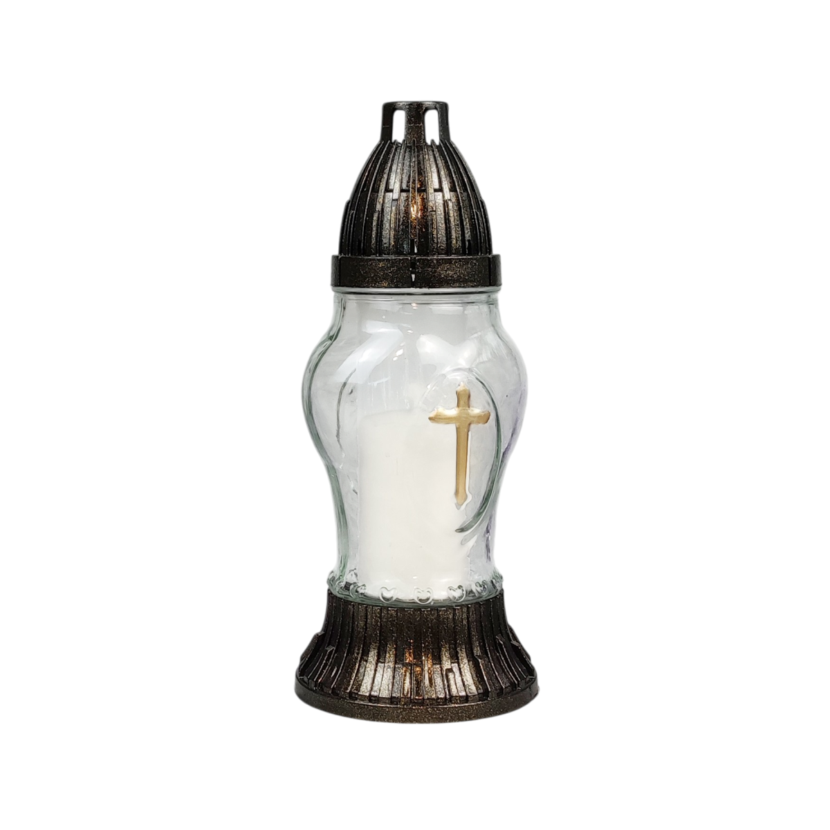 Лампадка меморіальна зі скляною колбою та декоративним хрестом — стриманий та елегантний виріб для вшанування пам’яті близьких. Прозоре фактурне скло гарно розсіює світло, створюючи м’яке та спокійне сяйво. Основа та кришка виконані з міцного пластику з ефектом бронзи, що забезпечує стійкість та довговічність. Лампадка підходить для використання зі змінними вкладками та LED свічками, практична у будь-яку погоду та зручна у щоденному використанні