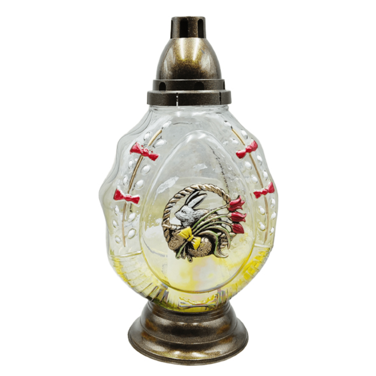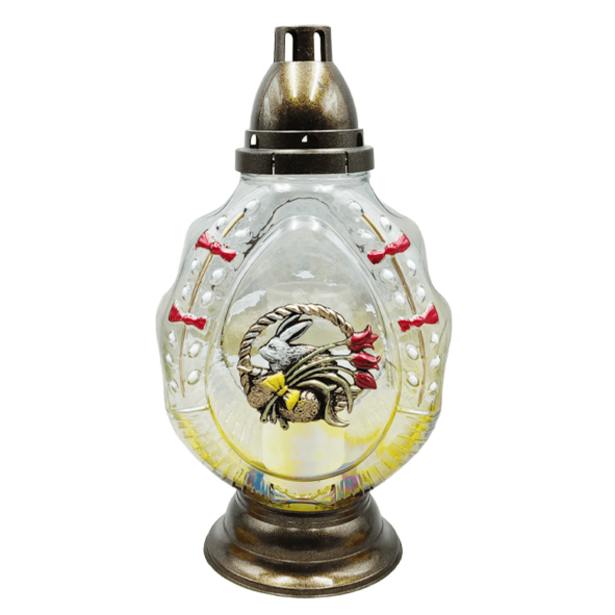 Декоративна ритуальна лампадка з великоднім оформленням — це красивий меморіальний виріб, який поєднує традицію пам’яті та символіку весняних свят. Лампадка виконана з прозорого рельєфного скла та прикрашена декоративною композицією із зайчиком, великодніми яйцями та весняними квітами, що символізують відродження, життя та надію.