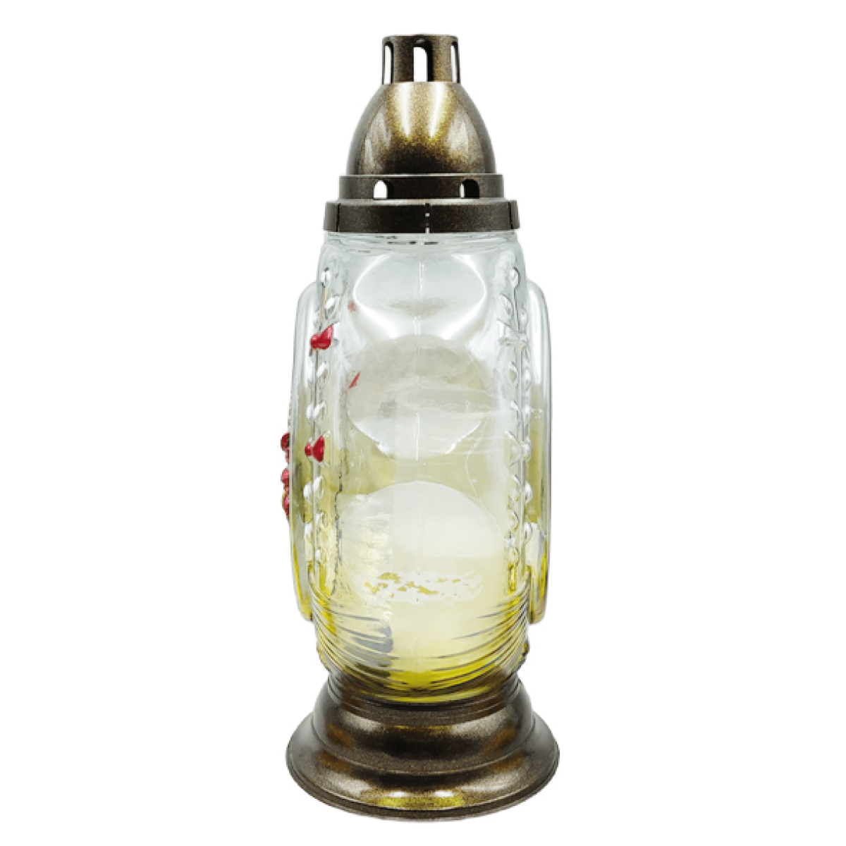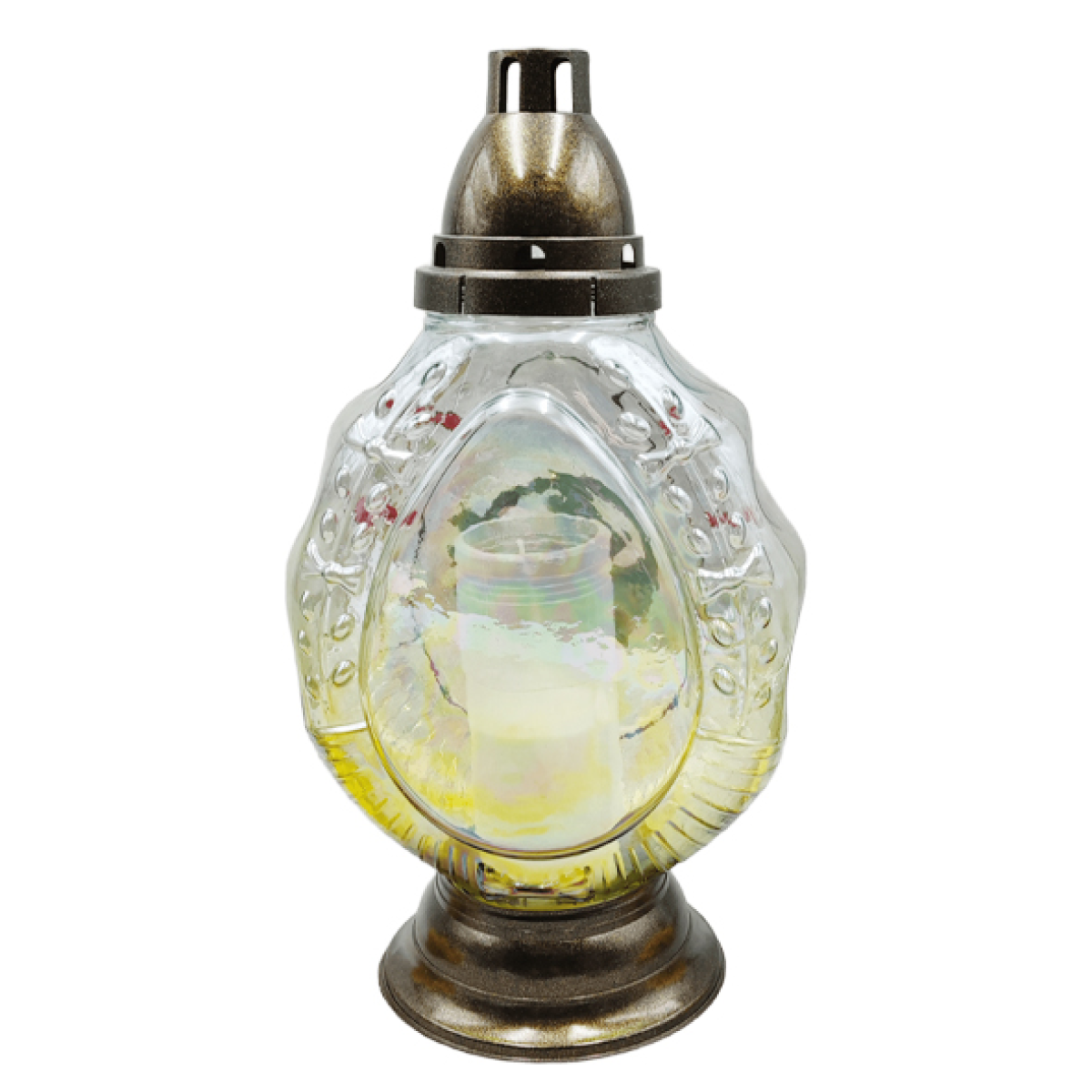 Вентиляційна кришка забезпечує стабільне горіння свічки та захищає полум’я від вітру і погодних умов. Стійка основа робить лампадку зручною для встановлення на могилі або меморіальній плиті.