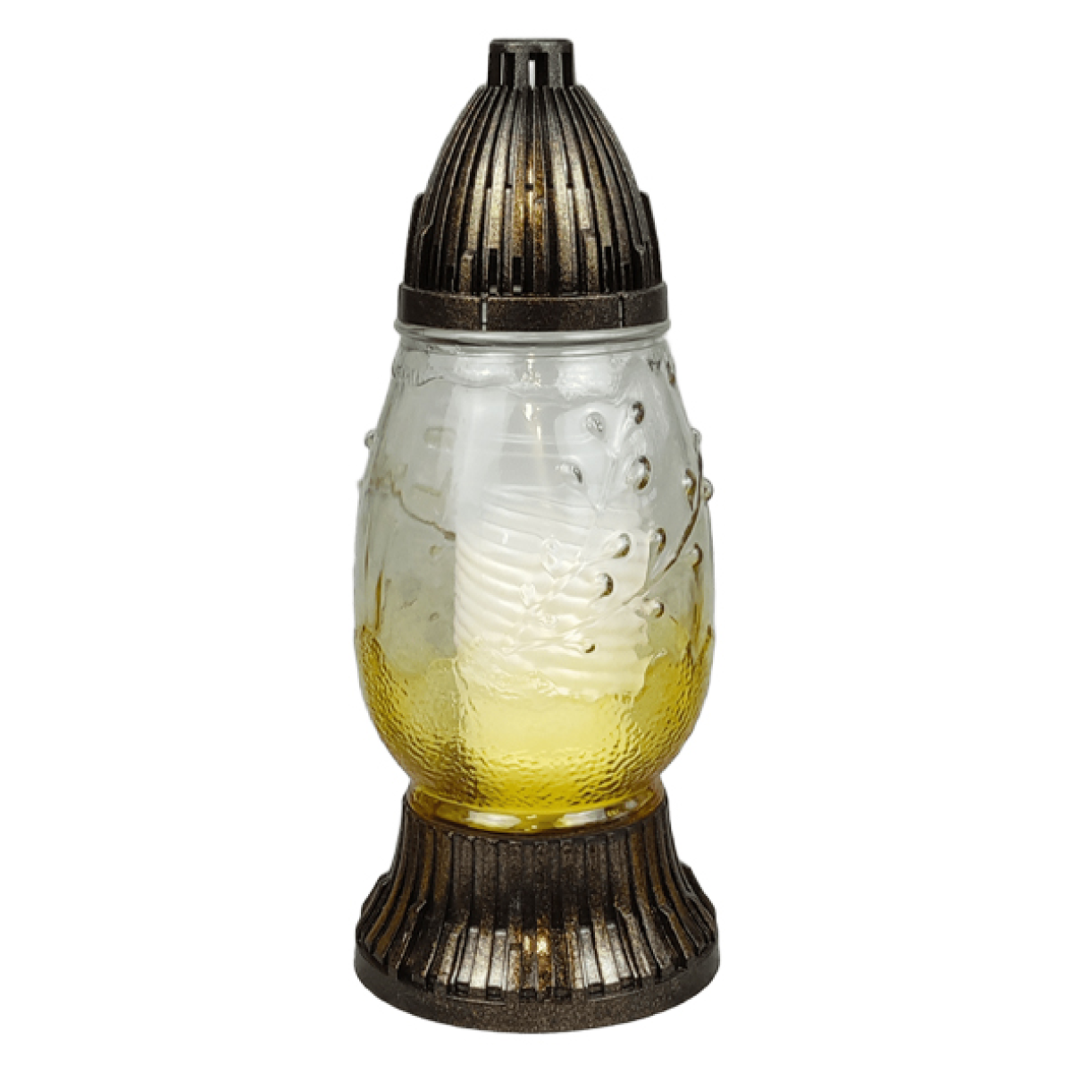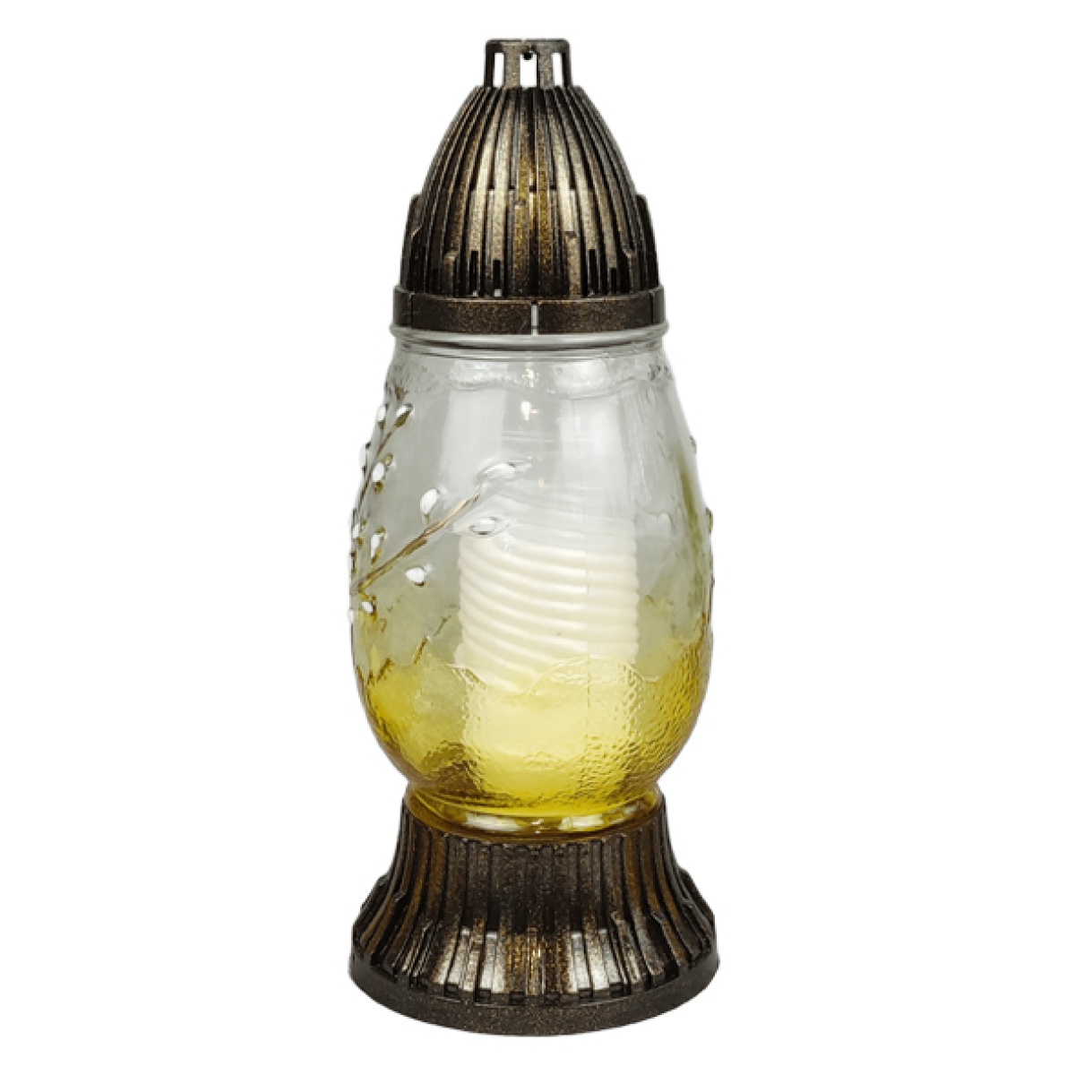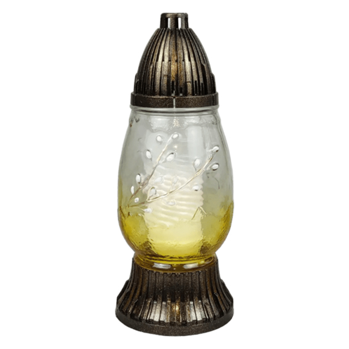 Декоративна ритуальна лампадка зі скляним корпусом — елегантний меморіальний виріб, призначений для вшанування пам’яті близьких. Лампадка має витончений дизайн із рельєфним орнаментом гілочок верби, що символізує весну, надію та духовне відродження. Завдяки кольоровому склу лампадка створює красиве та м’яке світіння свічки, яке додає місцю пам’яті особливої атмосфери спокою та світла.