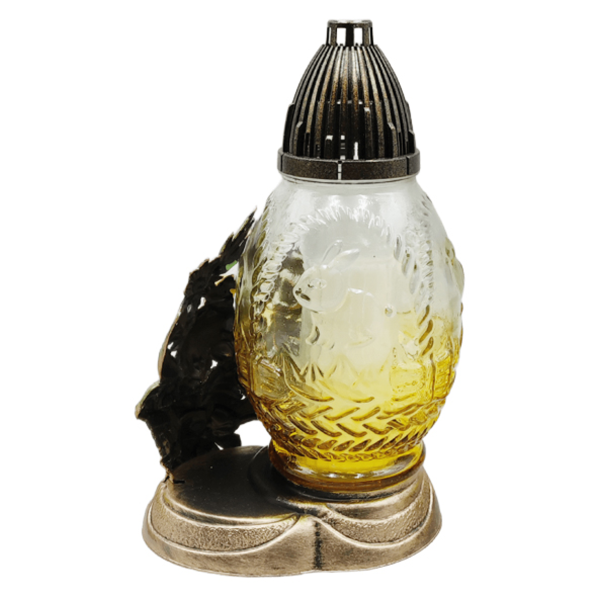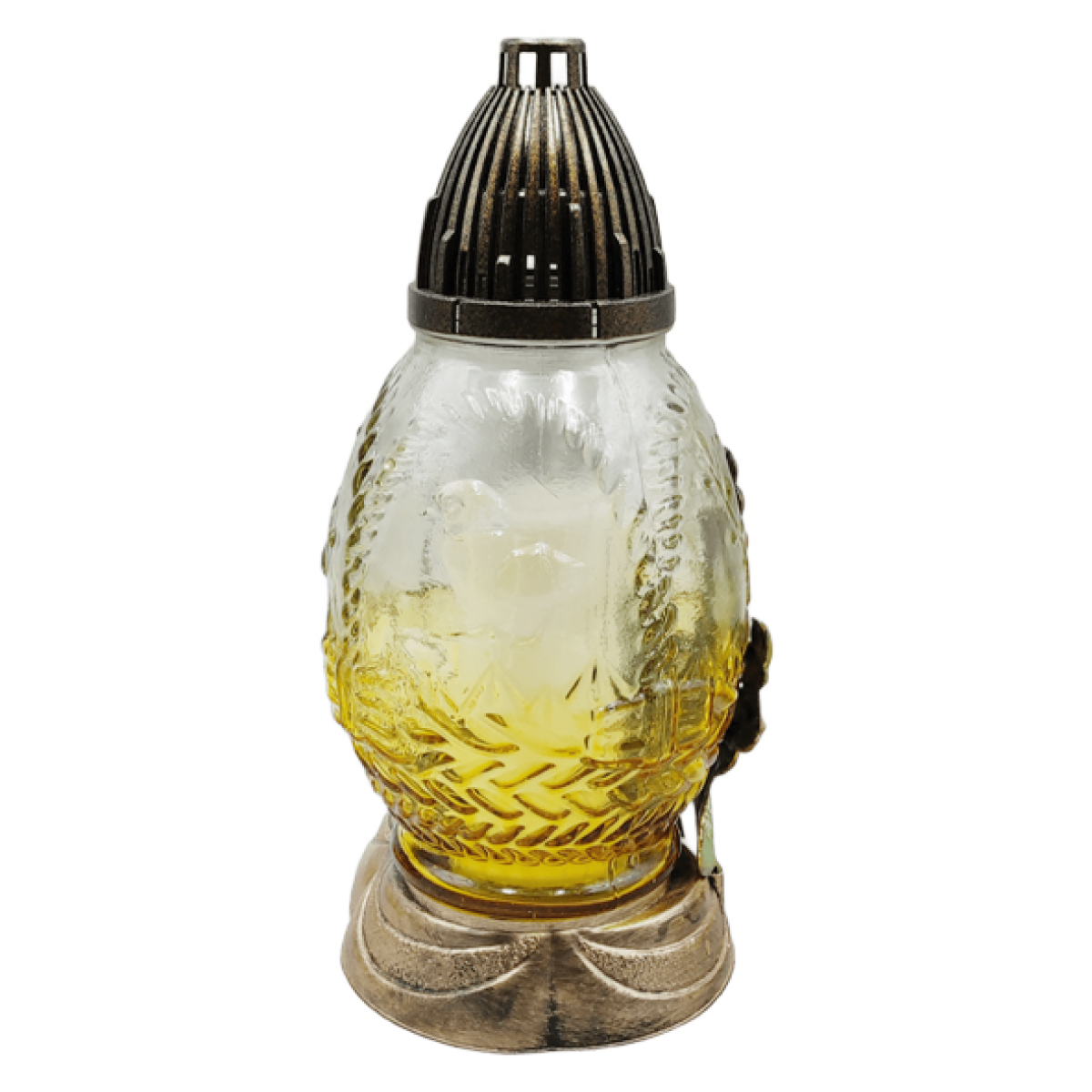 Верхня частина лампадки оснащена вентиляційною кришкою, яка підтримує стабільне горіння свічки та захищає полум’я від вітру і погодних умов. Завдяки міцній декоративній основі лампадка стійко встановлюється на могилі або меморіальній плиті.