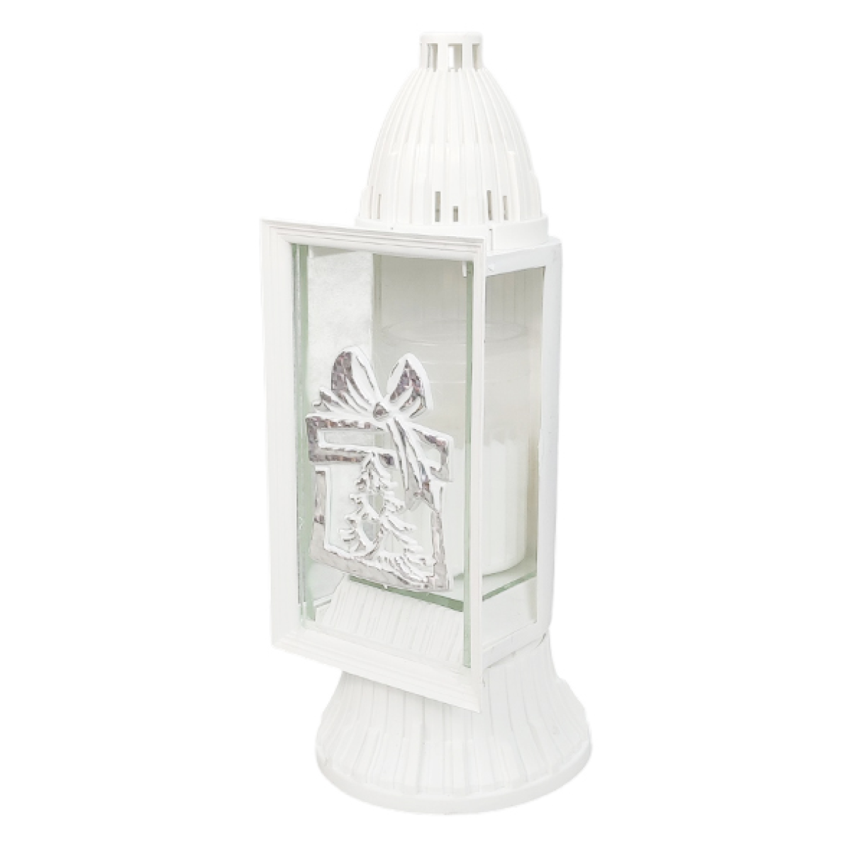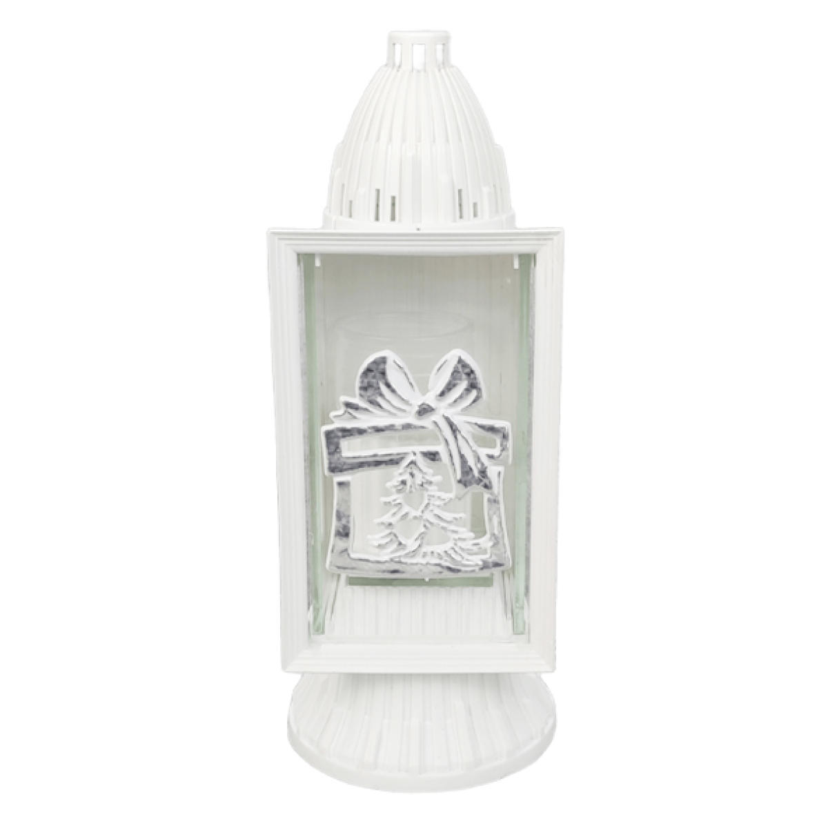 Лампадка «Різдвяний Подарунок» — стильний святковий декор, що поєднує атмосферу зимових свят та світло пам’яті. Білий корпус із прозорими скляними стінками прикрашений об’ємним декором у формі подарунка та різдвяної ялинки. Така лампадка використовується як лампадка на кладовище для вшанування пам’яті близьких у святковий період.Також може стати красивою прикрасою біля будинку, під ялинкою чи у дворі