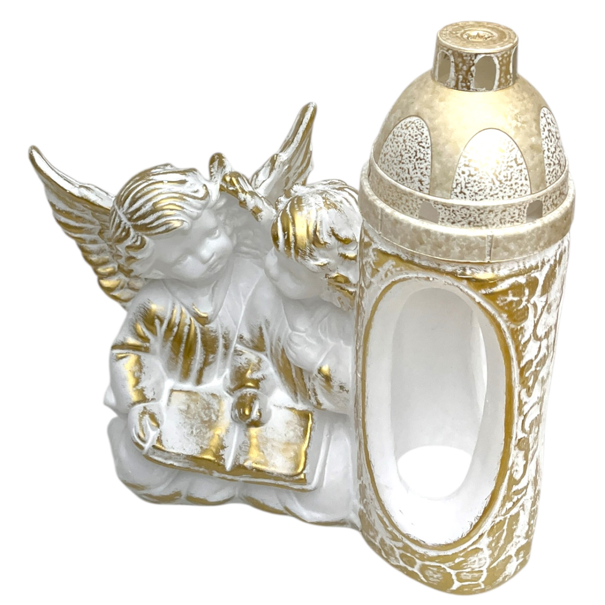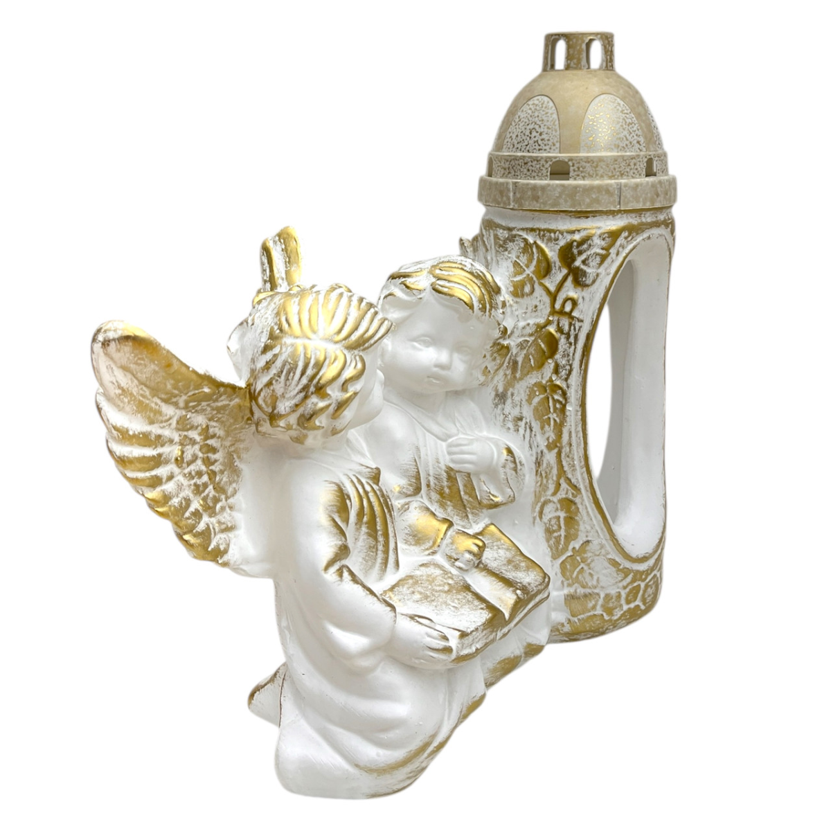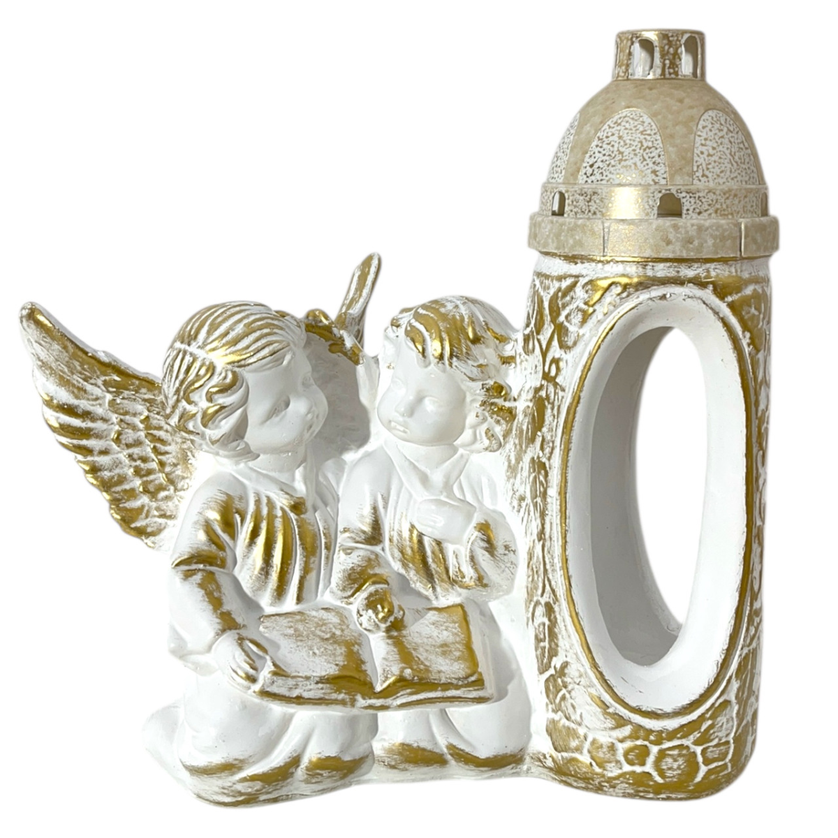 Гіпсова статуетка з лампадкою “Два янголи з книгою“ | Біло-золота | 30×30 см