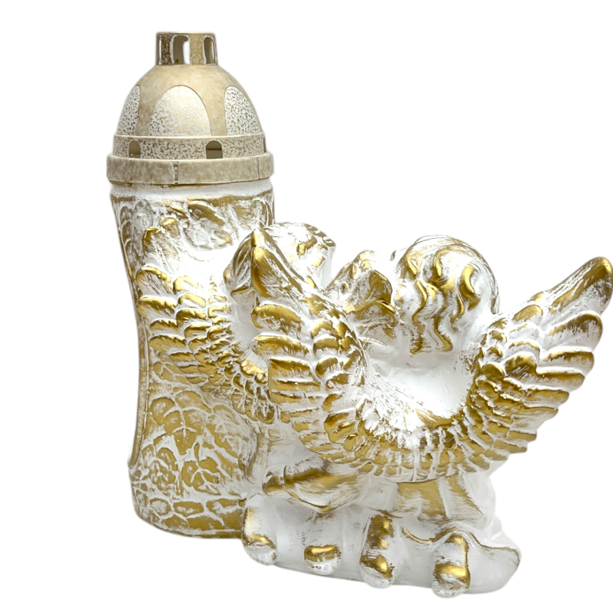 Гармонійна композиція з двома янголами, які тримають відкриту книгу, у поєднанні з декоративною лампадкою. Статуетка наповнена теплом, спокоєм і духовним змістом. Прекрасний вибір для вшанування пам’яті рідних як на цвинтарі, так і вдома. Характеристики: Матеріал: міцний декоративний гіпс Колір: білий з золотим патинуванням Висота: ~30 см Ширина: ~30 см Глибина: ~12 см Вага: 2,5 кг Тип використання: вуличне/домашнє Світловий елемент: місце для свічки або LED-лампочки (не входить у комплект) Переваги: Естетичний вигляд з глибоким символізмом Символічне зображення янголів як знак духовного захисту Якісне покриття, стійке до вигорання Гармонійно поєднується з іншими елементами декору Для поминальних свічок, декоративного освітлення, встановлення на кладовищі чи вдома Підходить для будь-якої пори року Догляд: Протирати сухою або злегка вологою тканиною. Уникати сильного механічного впливу. Для тривалого збереження фарби рекомендовано ставити під накриття. Пакування: надійне пакування для транспортування без пошкоджень.