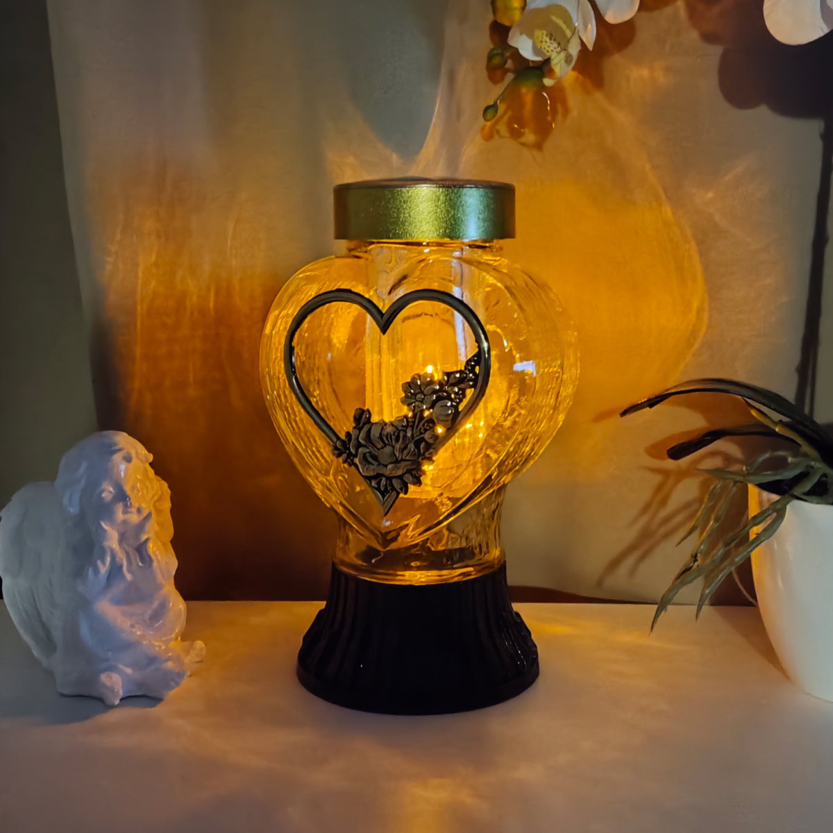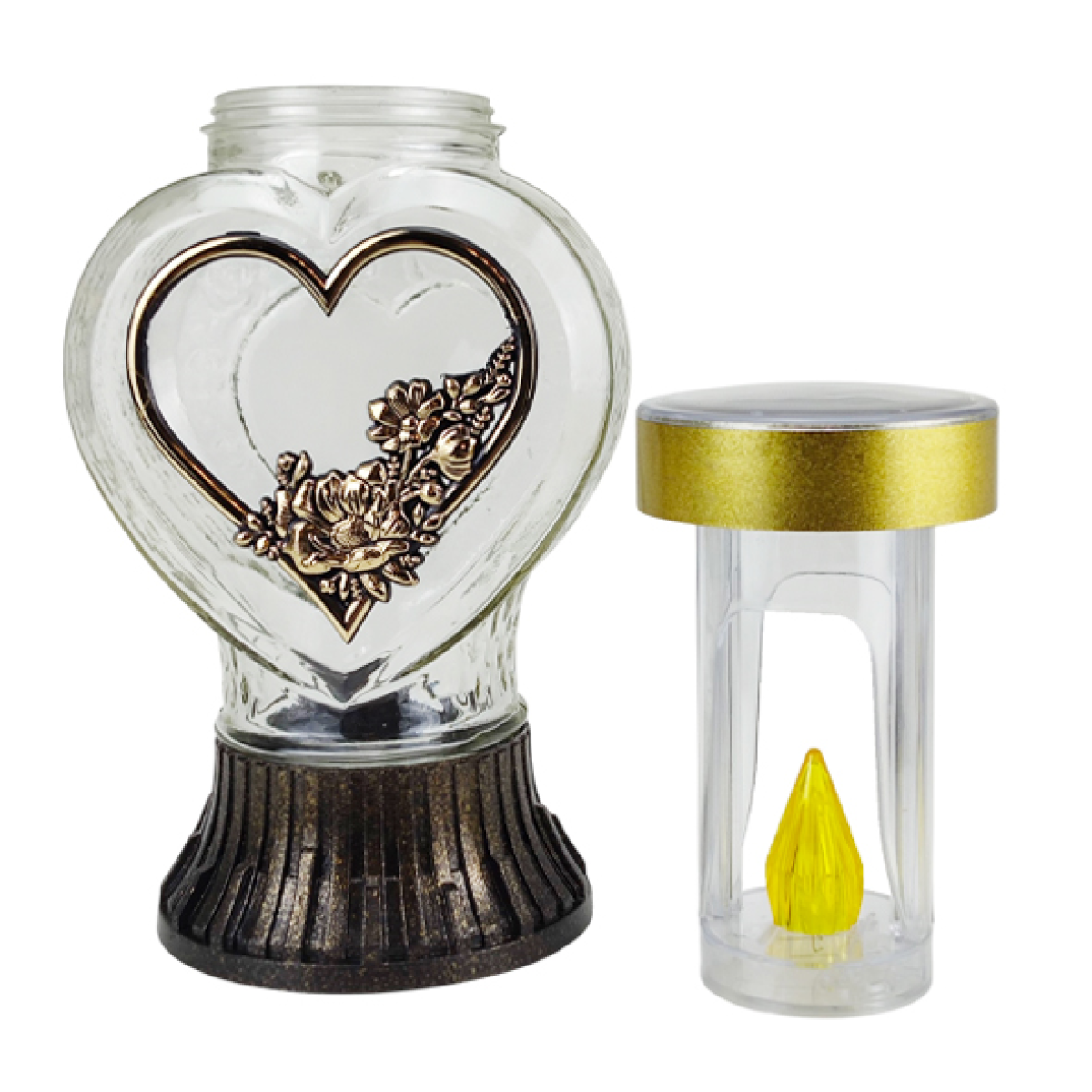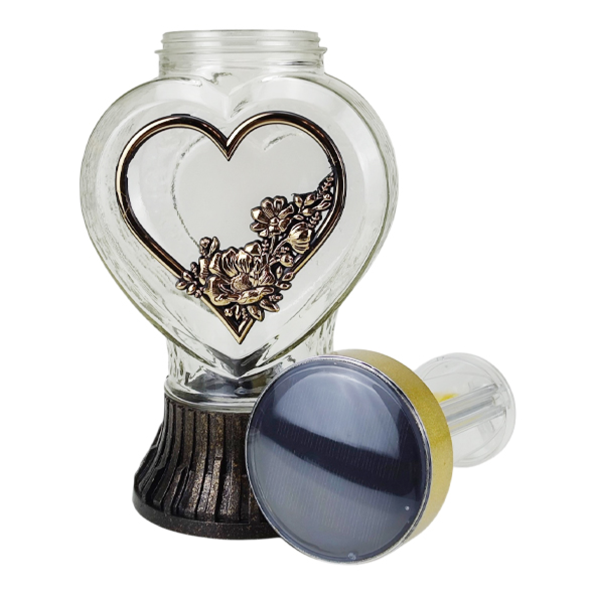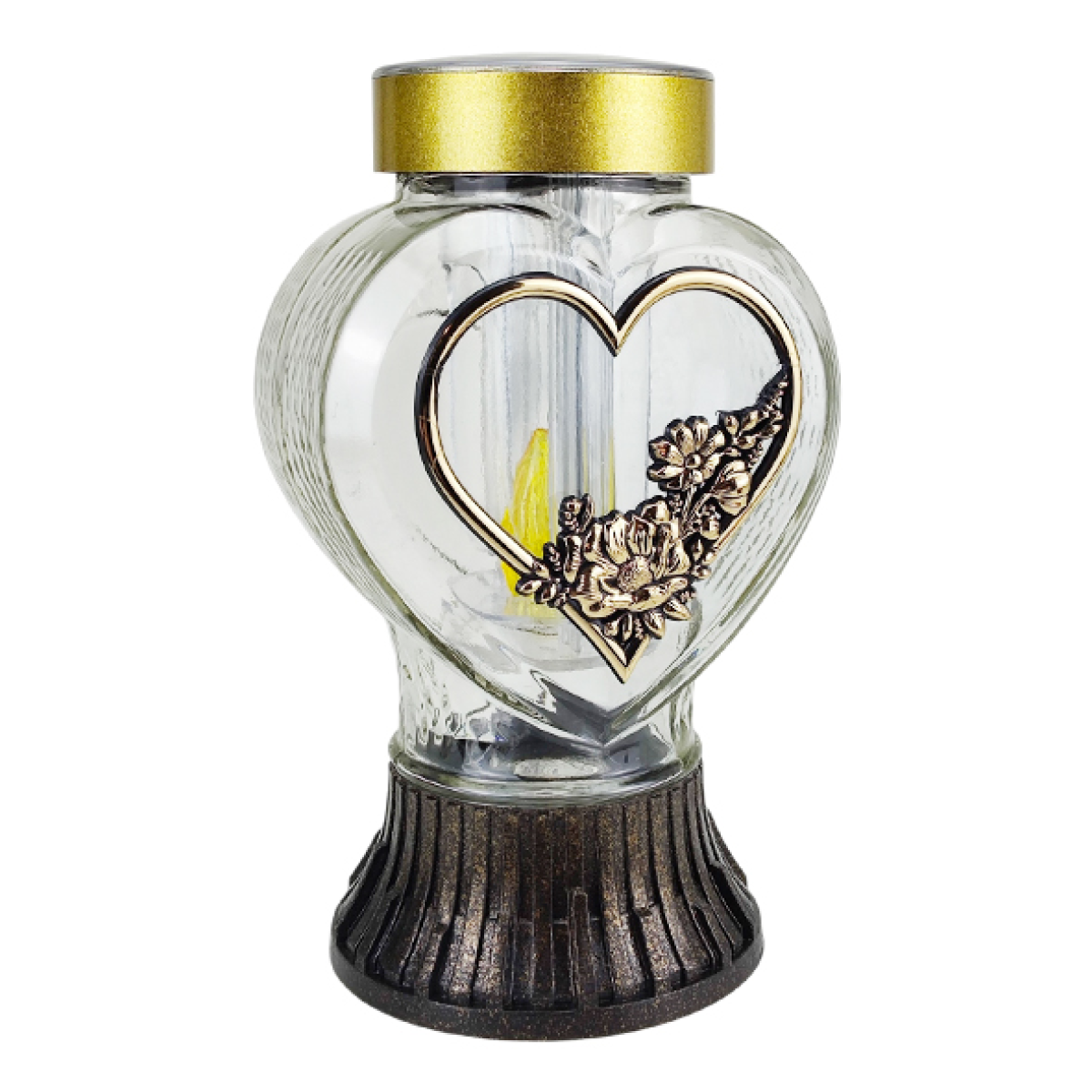 Декоративна лампадка на сонячній батареї у формі серця — сучасне та практичне рішення для вшанування пам’яті близьких. Завдяки елегантному дизайну у вигляді серця з декоративним квітковим орнаментом лампадка символізує любов, пам’ять і світло, що зберігається у серці назавжди.